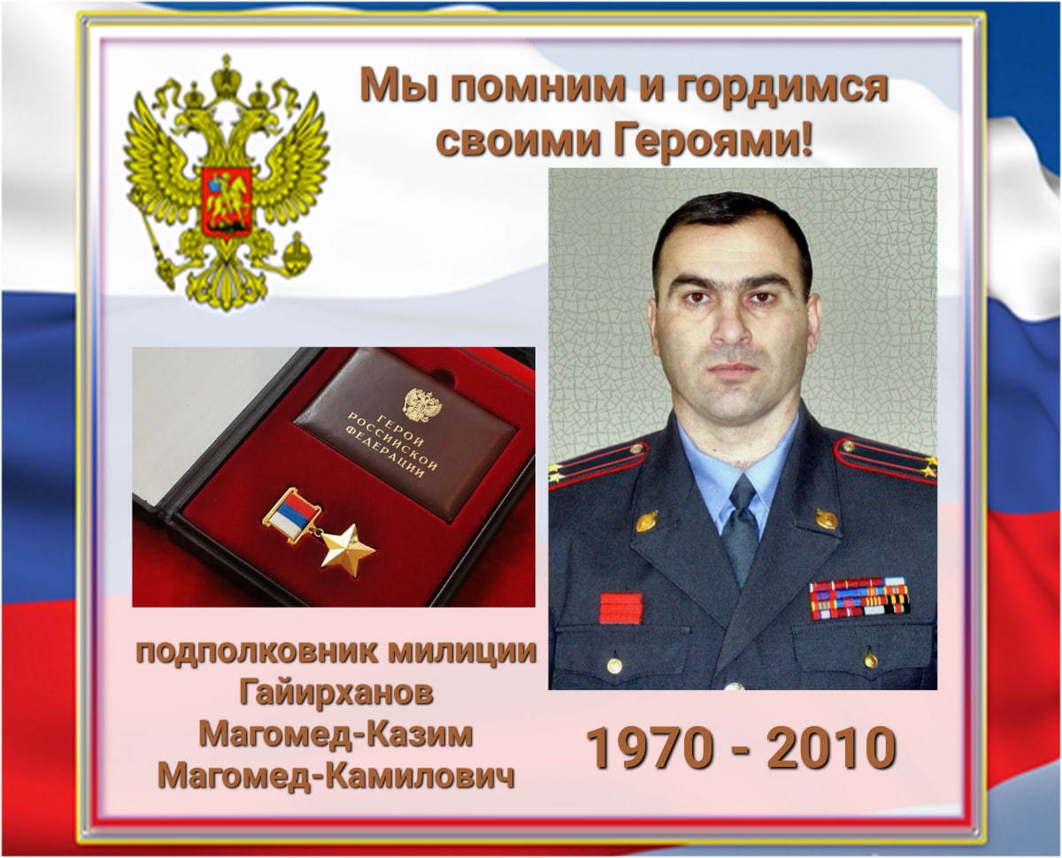 За мужество и героизм, проявленные при исполнении служебного долга в Северо-Кавказском регионе, Указом Президента Российской Федерации подполковнику милиции Гайирханову Магомед-Казиму Магомед-Камиловичу присвоено звание Героя Российской Федерации (посмертно).