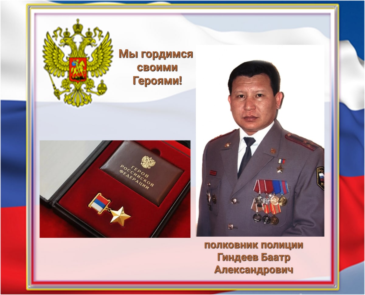 За мужество и отвагу, проявленные при ликвидации незаконных формирований в Северо-Кавказском регионе, Указом Президента РФ майор милиции Гиндеев Баатр Александрович награжден Золотой звездой «Герой России».