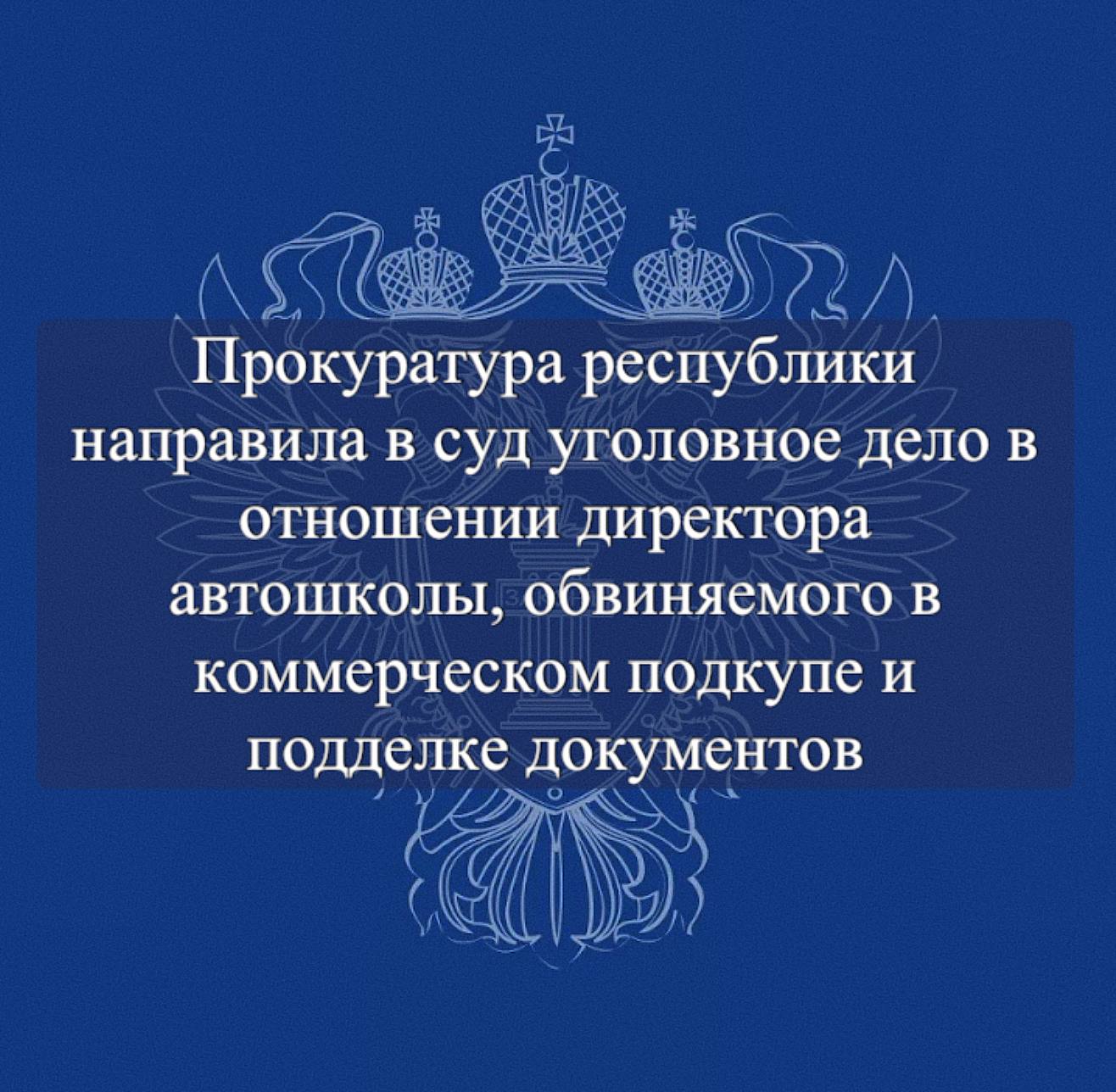 Прокурор Республики Калмыкия утвердил обвинительное заключение в отношении 73-летнего генерального директора автошколы, расположенной в г. Элисте. Он обвиняется по п. «в» ч. 7 ст. 204 УК РФ (коммерческий подкуп) и ч. 1 ст. 327 УК РФ (подделка официального документа, предоставляющего права, в целях его использования).