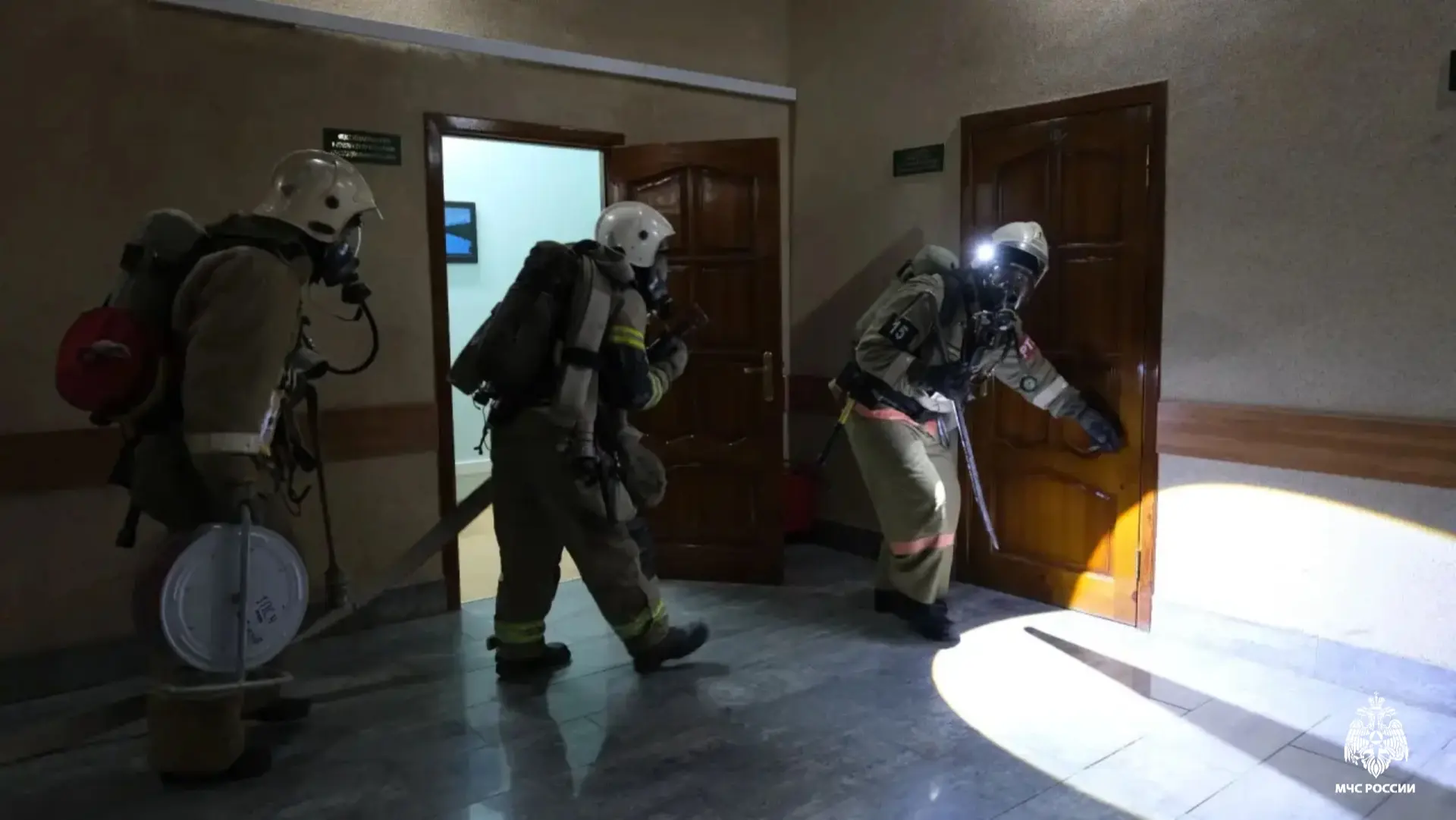 "На их спасение были направлены звенья газодымозащитной службы, которые оперативно провели разведку, обнаружили статистов и вывели их из здания", – пояснил начальник дежурной смены СПТ регионального МЧС Арслан Шотлаев.