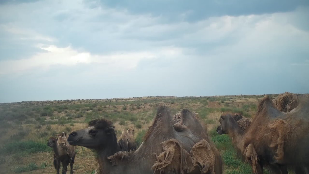 В заповеднике «Черные земли» весенняя линька превращает верблюдов в настоящих «первобытных дикарей» — их косматый вид напоминает доисторических обитателей этих мест.
