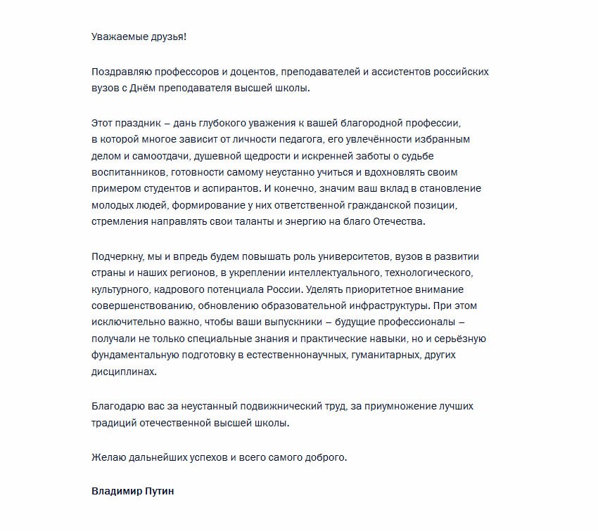 Владимир Путин поздравил российских педагогов с Днем преподавателя высшей школы.