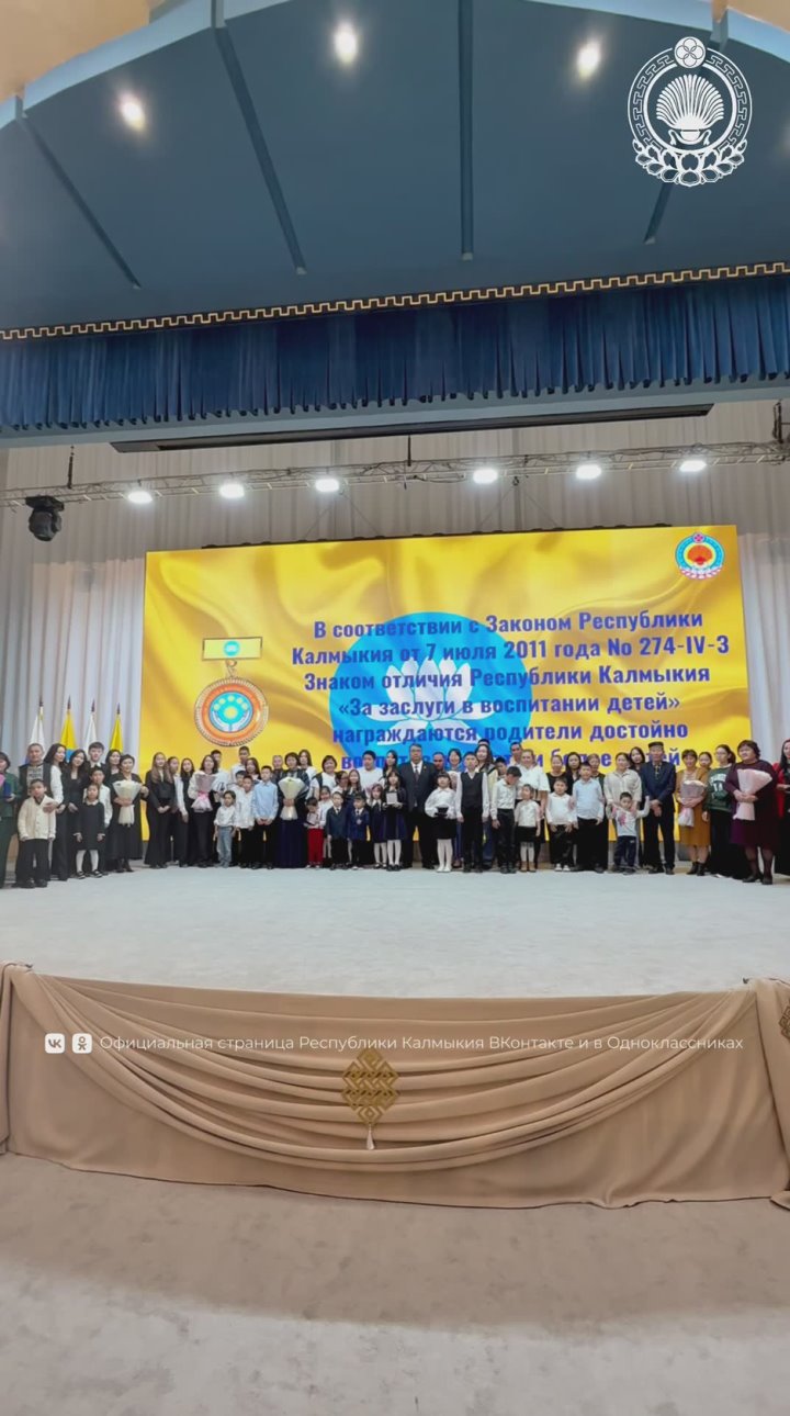 На торжестве вручили 11 знаков отличия Республики Калмыкия «За заслуги в воспитании детей» семьям, в которых воспитывается пятеро и более детей. Это Руслан и Сацита Темуркаевы из Городовиковского района, Виктор и Нина Бурлыковы из Кетченеровского, Санал и Любовь Кадаевы из Целинного, Юрий и Надежда Убушеевы из Черноземельского, Гаря и Марина Сокалиевы из Юстинского, Мерген и Марина Гуспановы из Яшалтинского, Аркадий и Клара Оргаевы из Яшкульского района и элистинские семьи: Михаил и Кермен Тимашовы, Виктор и Делгер Ходеевы, Владимир и Ева Манджиевы, а также Антонина Озаева.