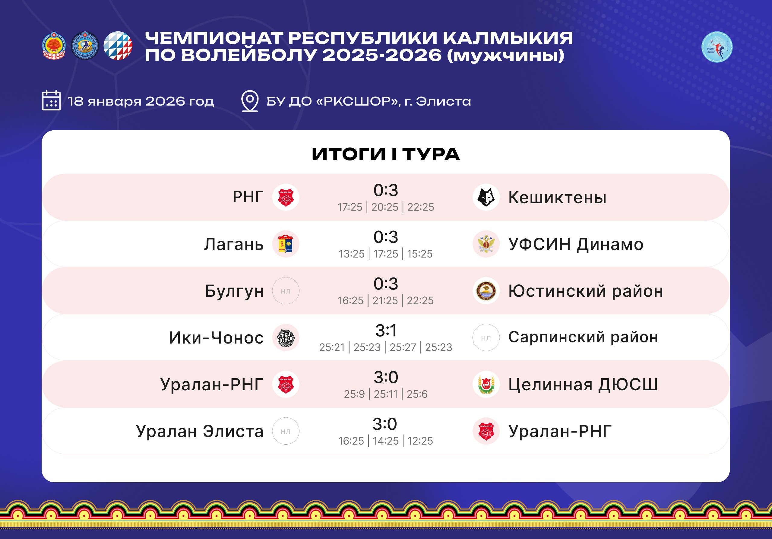 Мужской турнир не уступал женскому в напряжении и эмоциях. «Кешиктены», «УФСИН Динамо» и Юстинский район уверенно отстояли свои позиции, демонстрируя опыт и стратегию. «Ики-Чонос» и Сарпинский район подарили болельщикам захватывающие моменты, где каждая партия была решающей. «Уралан-РНГ», «Уралан Элиста», «РНГ», Лагань, «Булгун» и Целинная ДЮСШ» показали, что каждая команда готова бороться до последнего мяча и радовать зрителей настоящим волейболом.