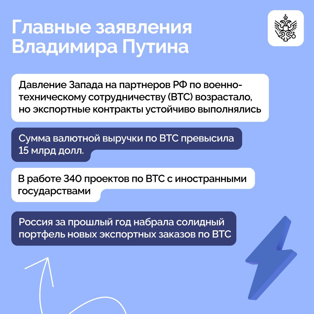 Глава государства отметил, что, несмотря на давление Запада, российская продукция экспортировалась более чем в 30 стран мира, а выручка превысила 15 млрд долларов. Он также заявил, что объемы военного экспорта на 2026 должны существенно увеличиться.