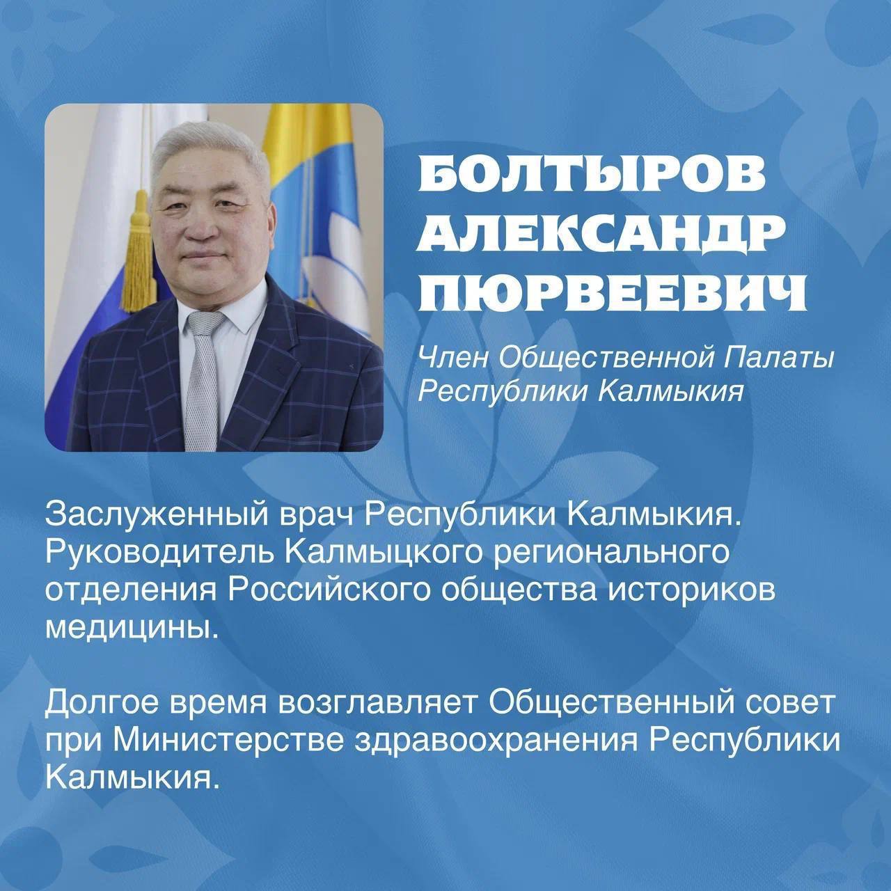Министр здравоохранения Калмыкии Булат Сараев поздравил Александра Болтырова, отметив его многолетний опыт и значительный вклад в развитие здравоохранения региона. Александр Болтыров возглавляет Калмыцкое региональное отделение Российского общества историков медицины и Общественный совет при Минздраве.
