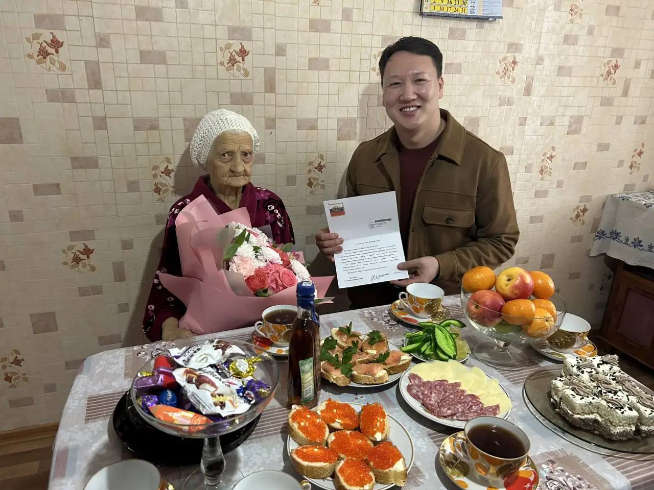Смолякова Анна Прокофьевна - Ветеран ВОВ, труженик тыла. В день её Рождения депутат #ЭГС Алдар Конушев поздравил именинницу, вручив букет цветов. Зачитал письмо от Президента России В.В. Путина и передал подарок от муниципалитета в знак уважения и благодарности за её подвиг и труд в годы войны и мирной жизни.