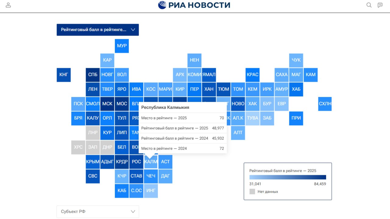 Исследование провели эксперты РИА Новости. Республика поднялась на две строчки по сравнению с предыдущим годом (с 72-го места), а рейтинговый балл вырос с 45,932 до 48,977.