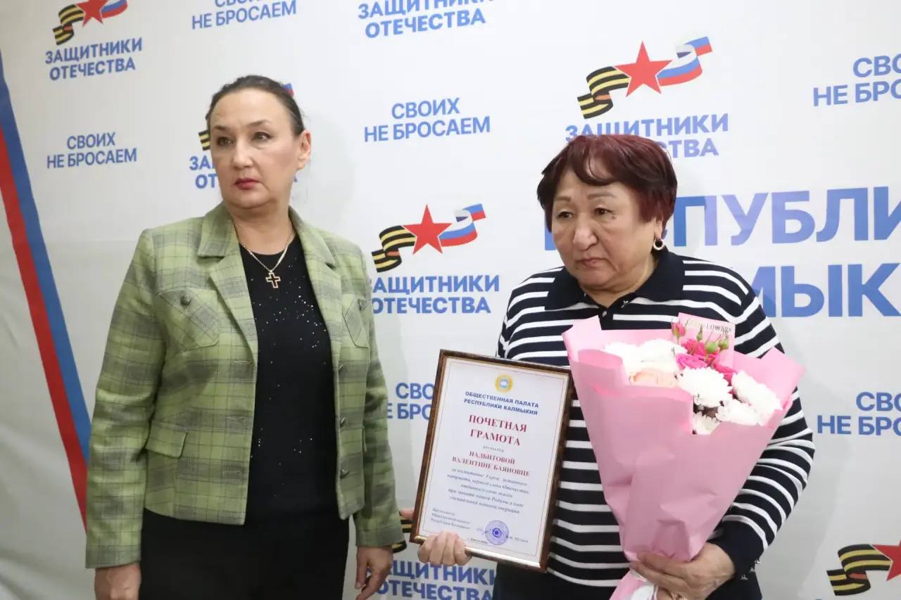 Заместитель председателя Общественной палаты Республики Калмыкия Елена Крылова вручила почетные грамоты палаты Ларисе Абушиновой и Валентине Надбитовой
