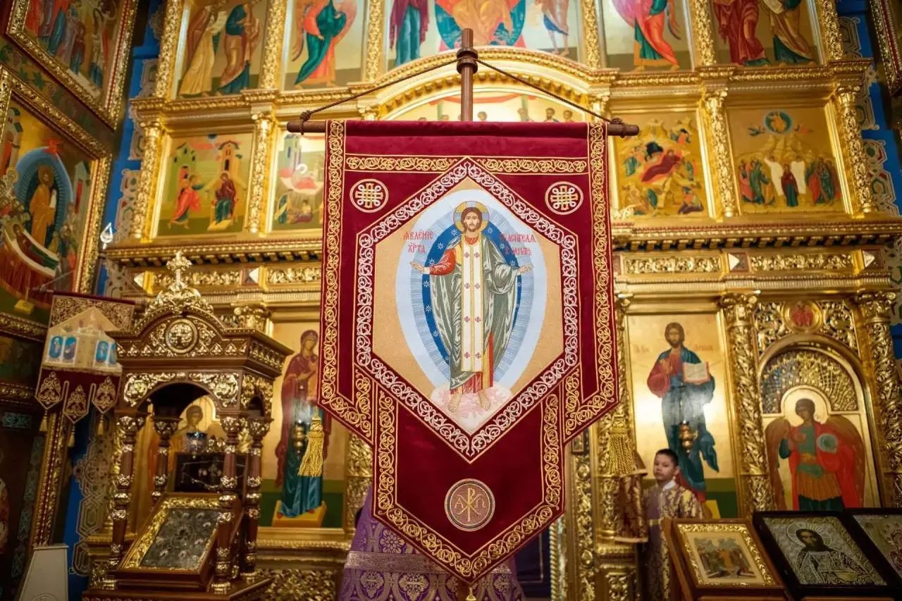 1 марта 2026 года, в день праздника Торжества Православия, в Казанском кафедральном соборе города Элисты состоялось торжественное освящение хоругви «Явление Христа Спасителя в Элисте»