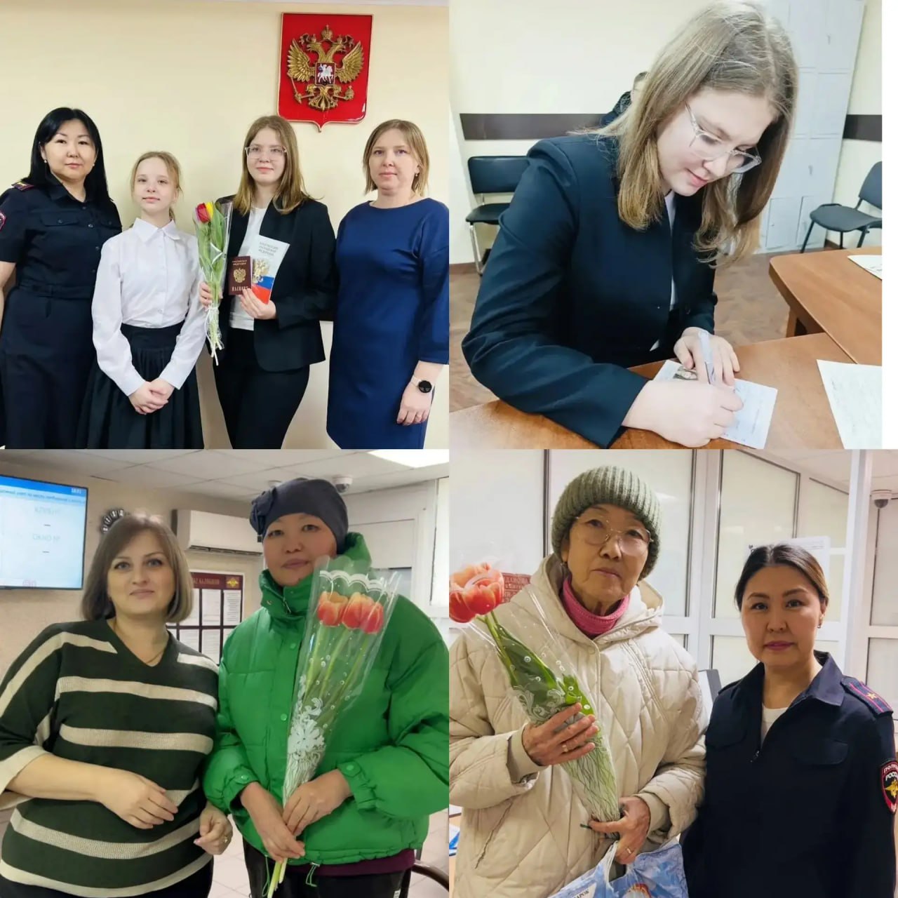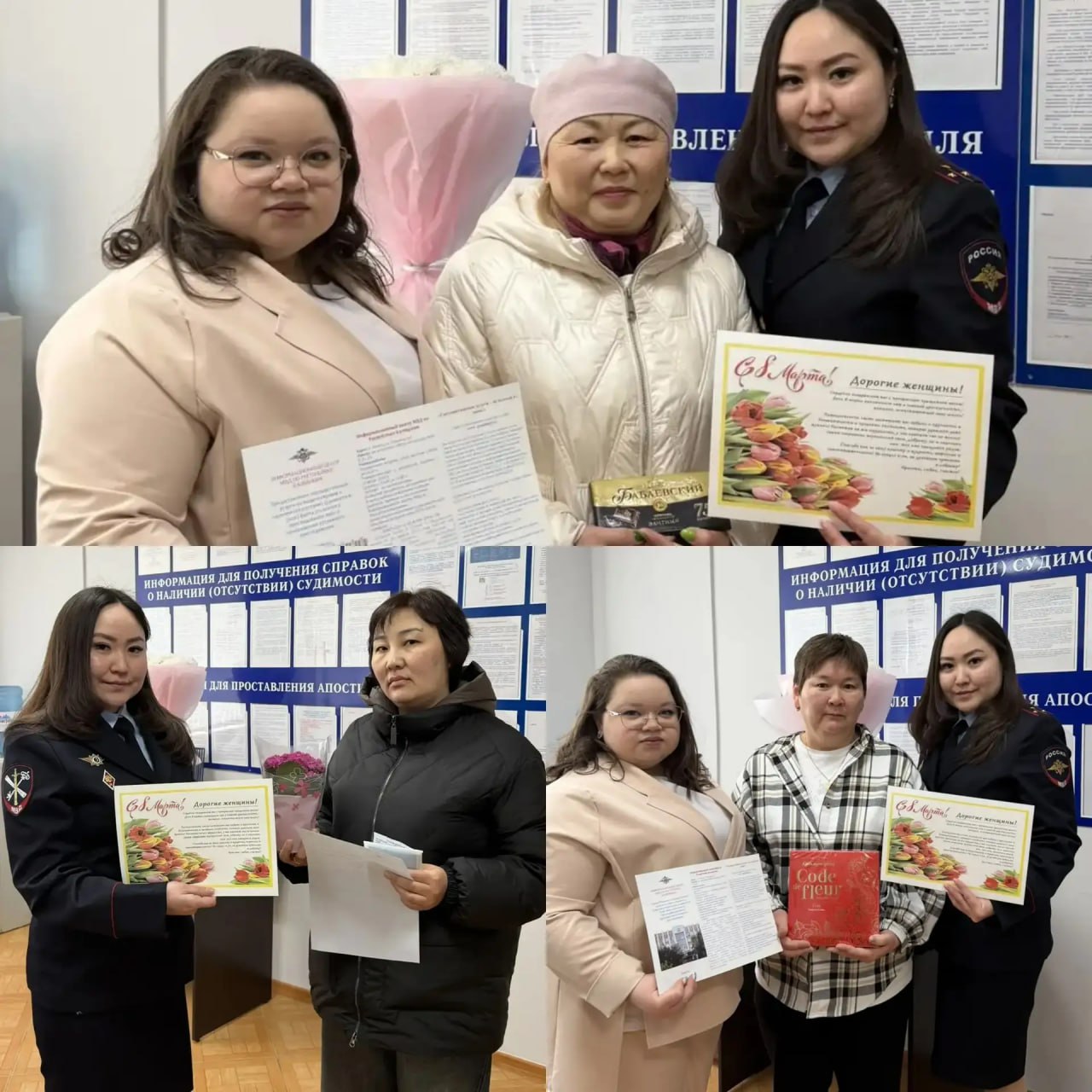 В преддверии праздника сотрудники информационного центра и отдела по вопросам миграции поздравляли женщин, обратившихся за госуслугами, вручая им цветы и подарки.