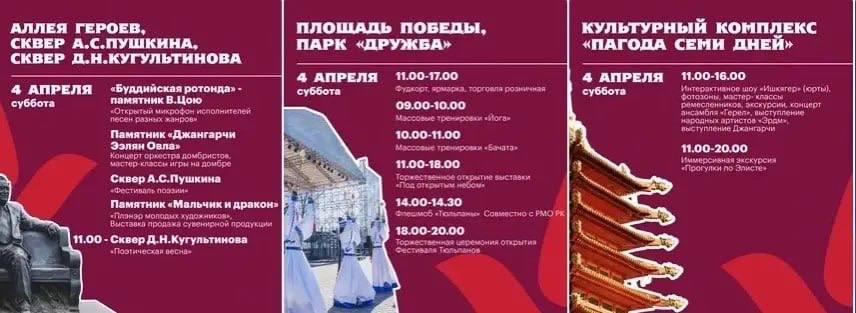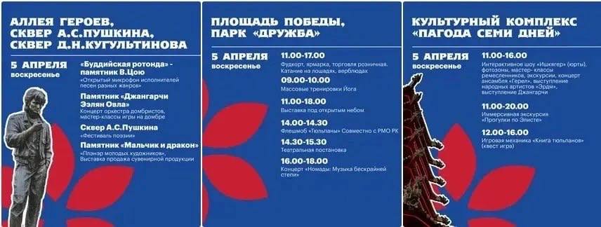 В 2026 году праздник пройдет с 4 по 28 апреля — именно в это время степи республики окрашиваются в алые оттенки цветущих тюльпанов и наполняются атмосферой настоящего весеннего пробуждения.