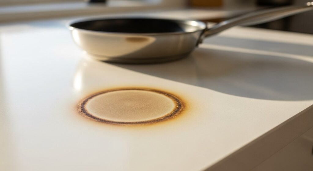 Черные акриловые поверхности особенно подвержены термическим повреждениям — даже с одного конца кухни можно заметить след от сковороды.