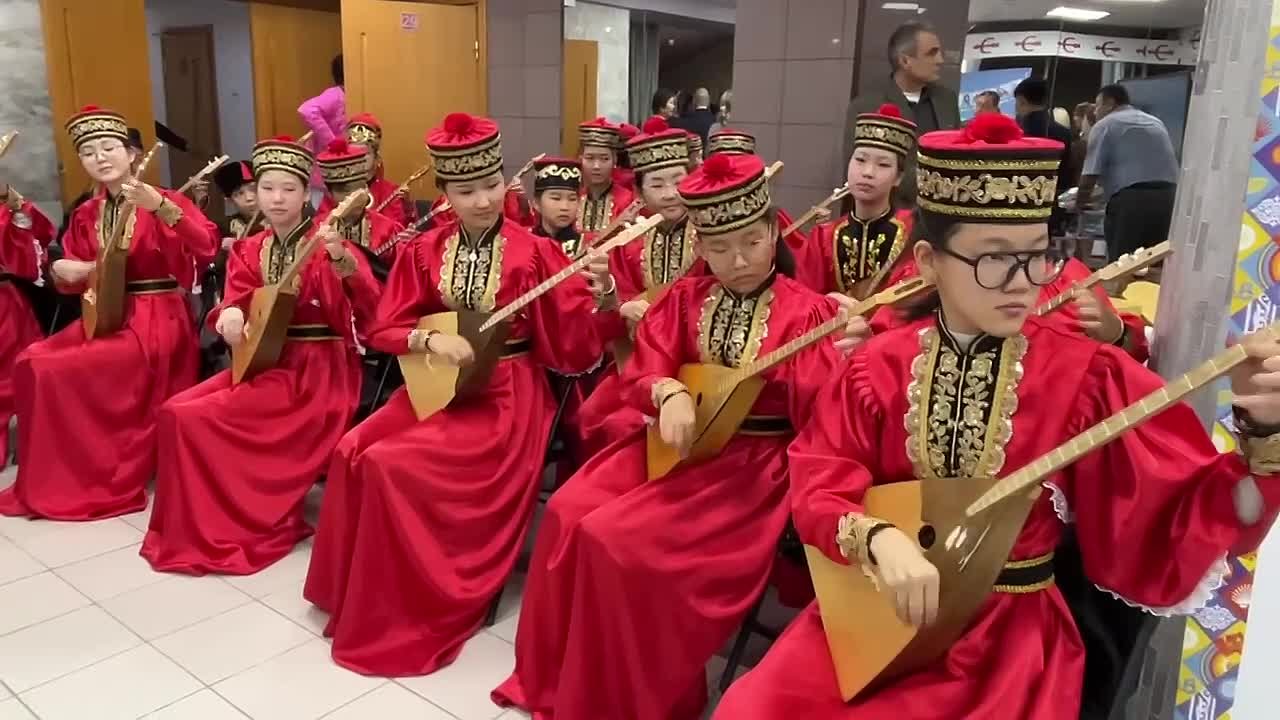 Гостей мероприятия встречают юные домбристы, создавая неповторимую атмосферу национального колорита