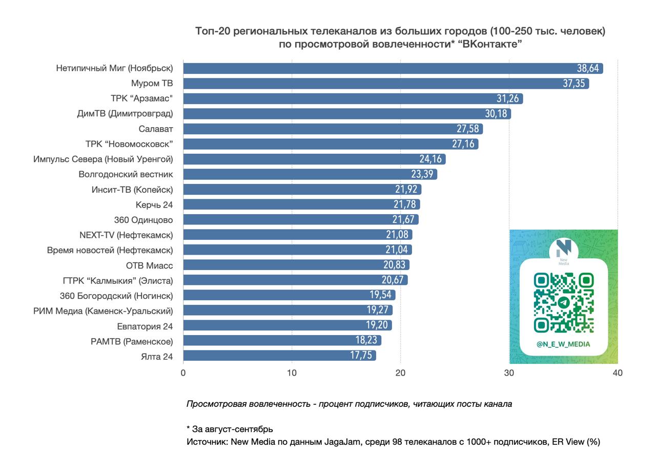 По итогам сентября 2025 года наш телеканал занял 16-е место в рейтинге самых просматриваемых и 15-е место по просмотровой вовлеченности среди региональных СМИ из городов с населением 100–250 тысяч человек.