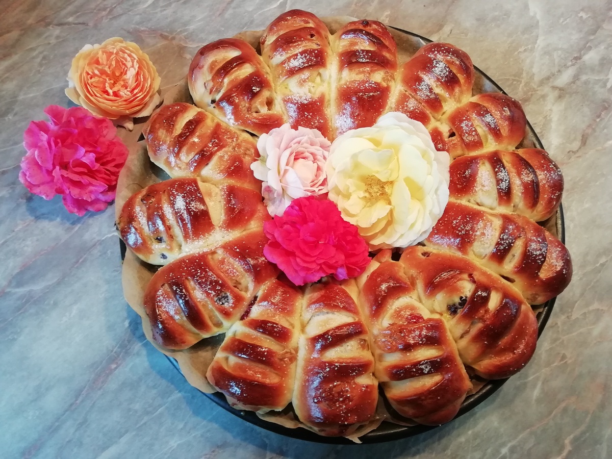 На противень укладываются булочки, оставляя их подходить еще на 20 минут. Перед отправкой в духовку их смазывают взбитым яйцом для получения румяной корочки. Выпекается венок при температуре 180°С около 25 минут, пока не приобретет золотистый оттенок и душевный аромат.