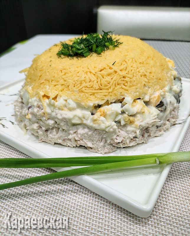 Если предпочтительнее использовать разъемное кольцо, порядок слоев будет следующим: куриное мясо с майонезом, затем грибы с луком, снова майонез, яйца, ещё немного майонеза и, наконец, натертый сыр. Такой подход позволит сохранить идеальную форму и презентабельный вид.