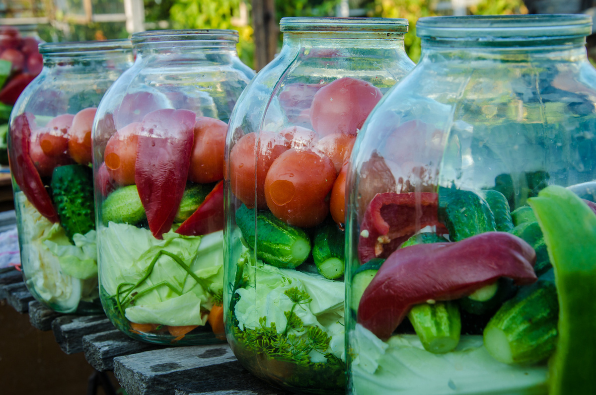 Перед тем, как приступить к закладке овощей, банки и крышки необходимо тщательно вымыть, а сами овощи — хорошо очистить. На дно банки помещаются укроп, нарезанный чеснок и специи. Затем идет процесс укладки овощей. Сначала кладутся огурцы, так как они требуют большего времени для прогревания. После огурцов добавляются лук, кабачки, сладкий перец и томаты — именно эти этапы создают тот неповторимый вкус.