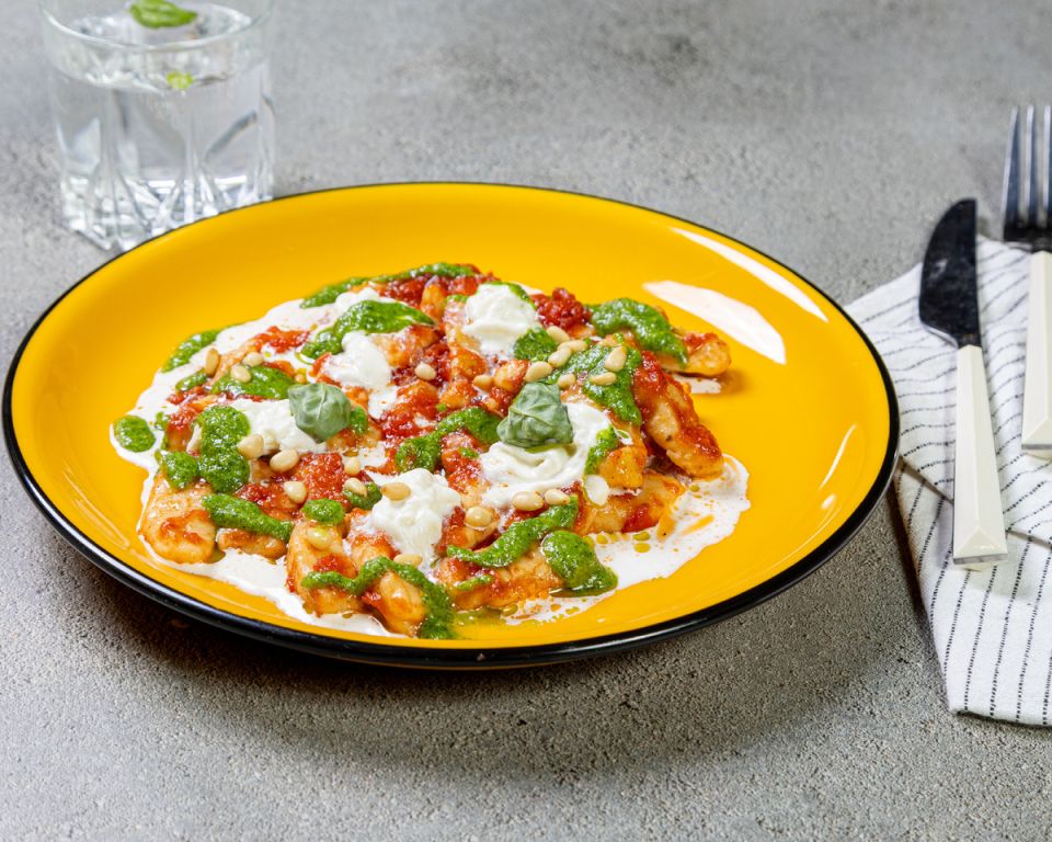 3. Сборка и подача. На сковороде разогреть немного оливкового масла, добавить протёртые томаты и уваривать 2-3 минуты. Выложить отваренные ньокки, аккуратно перемешать с соусом и прогреть ещё пару минут. При подаче на тарелку разместить ньокки, сверху добавить страчателлу и немного песто, посыпать кедровыми орехами и сбрызнуть оливковым маслом. Блюдо готово к наслаждению!