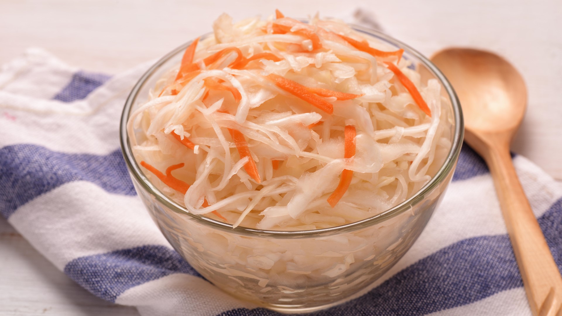 Потребуется: большой кочан капусты, три морковки, одна чайная ложка семян тмина или фенхеля, 120 миллилитров яблочного или винного уксуса (белого), одна столовая ложка сахара и две чайные ложки соли.