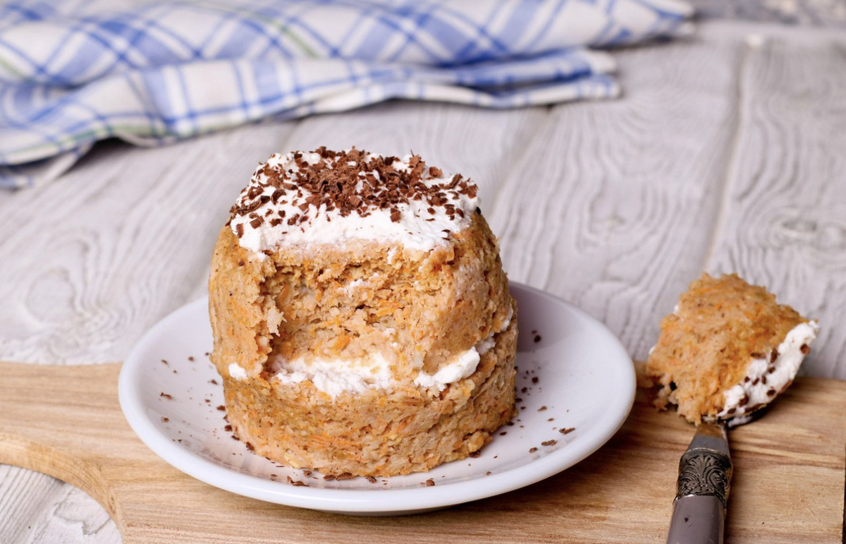 Приготовленное тесто вылить в смазанную маслом кружку или небольшие керамические формочки, заполнив их на 2/3 объема. Выпекать в микроволновой печи на мощности 700 Вт около 3 минут. Дать остыть и смазать творогом, по желанию украсить тертым шоколадом.