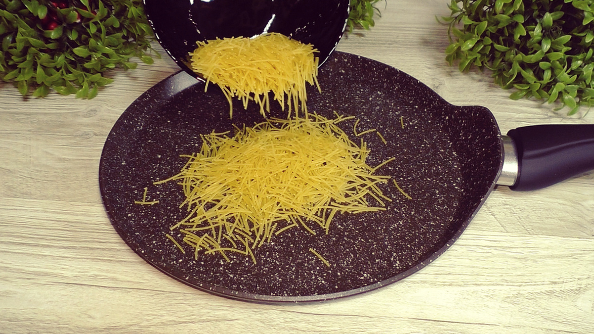 Приступить к приготовлению можно сразу. Первым делом нужно обжарить вермишель до золотистого цвета на сухой сковороде. Это придаст ей насыщенный вкус и хрустящую текстуру. Как только вермишель достигнет желаемого оттенка, ее стоит переложить в миску, чтобы остановить процесс жарки и избежать подгорания.