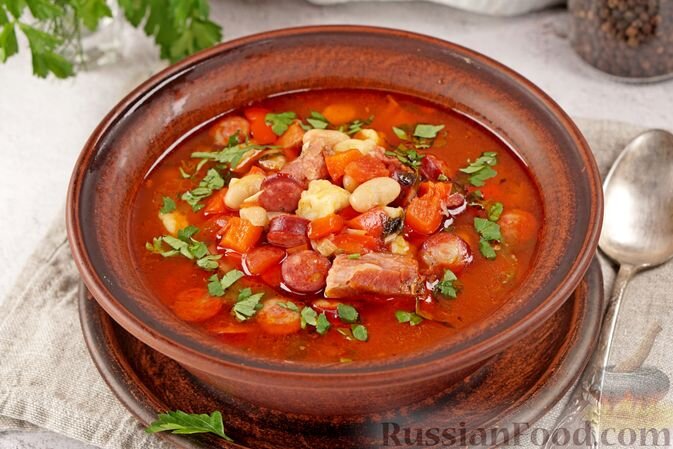 - Томатный суп с копчёностями и фасолью – насыщенный, с характерным ароматом копчёной паприки и пикантными чипетками.
