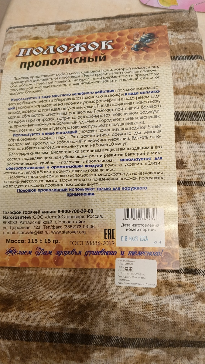 Прополисный повязок — это не просто настойка или мазь, а кусок ткани, пропитанный пчелиным воском и прополисом. Он обладает насыщенным, сладковатым ароматом, который напоминает о пасеке. Этот метод, по словам знающих людей, активно применяется для облегчения болей в суставах и стопах, а также при радикулите.