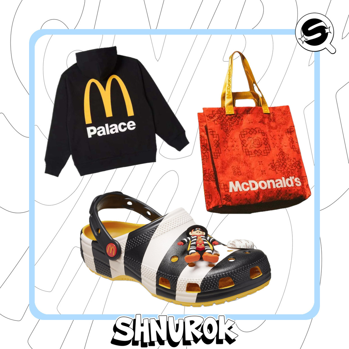 - Футболка Palace x McDonald's: культовая коллаборация британского скейт-бренда с фастфудом. Уникальный дизайн, лаконичность и ирония — всё, что нужно для выделения в толпе.