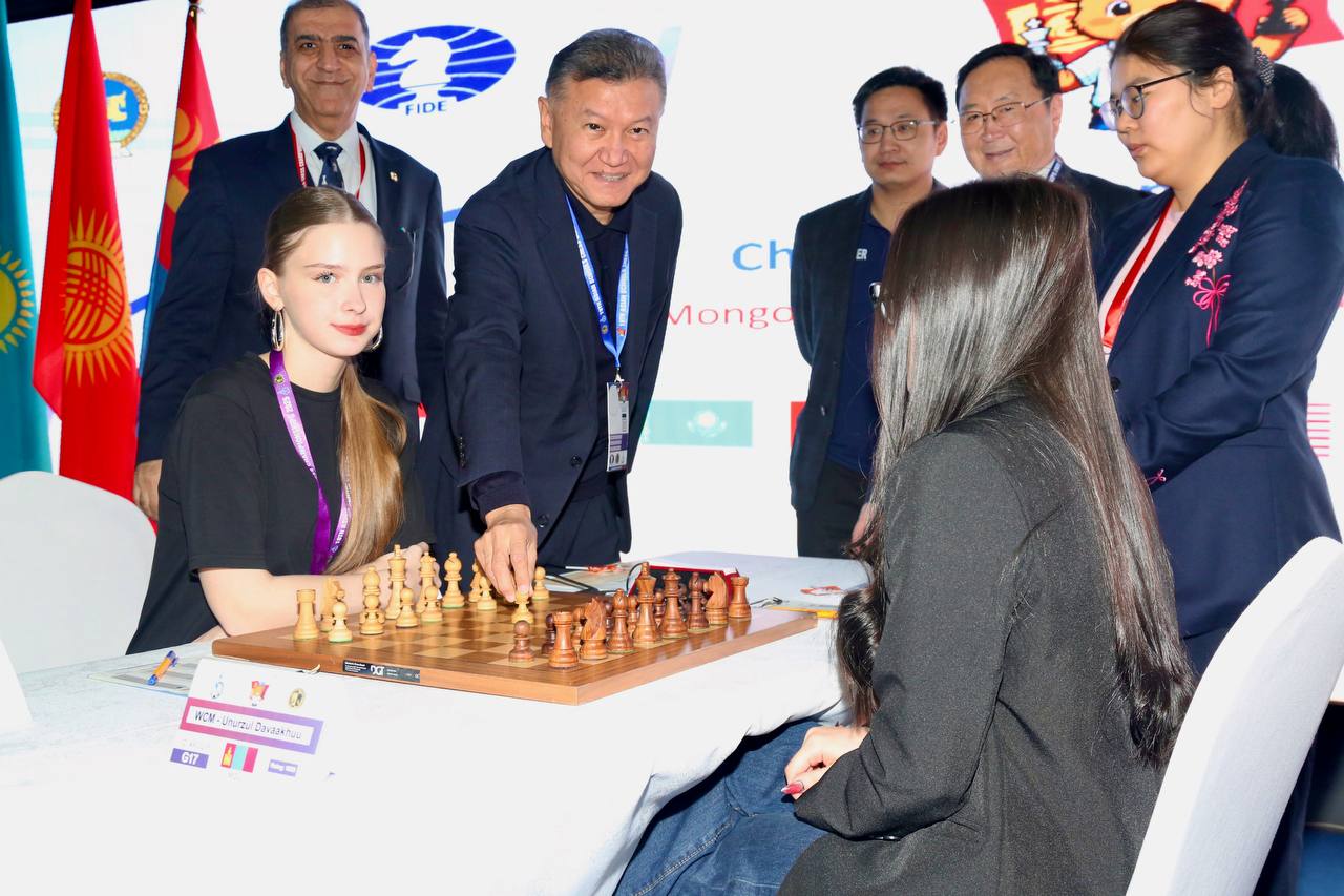 Первый ход заключительного тура чемпионата Азии по шахматам среди школьников сделал экс-глава ФИДЕ Кирсан Илюмжинов в партии лидера турнира в своей возрастной категории, россиянки Евгении Сатановской.