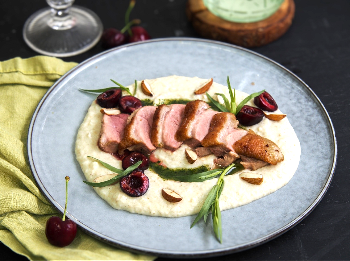 Подавайте утиную грудку с пюре, полив соусом из тархуна, посыпав миндалем и украшая черешней и листиками тархуна. Эта кулинарная симфония подарит незабываемые впечатления от ужина!
