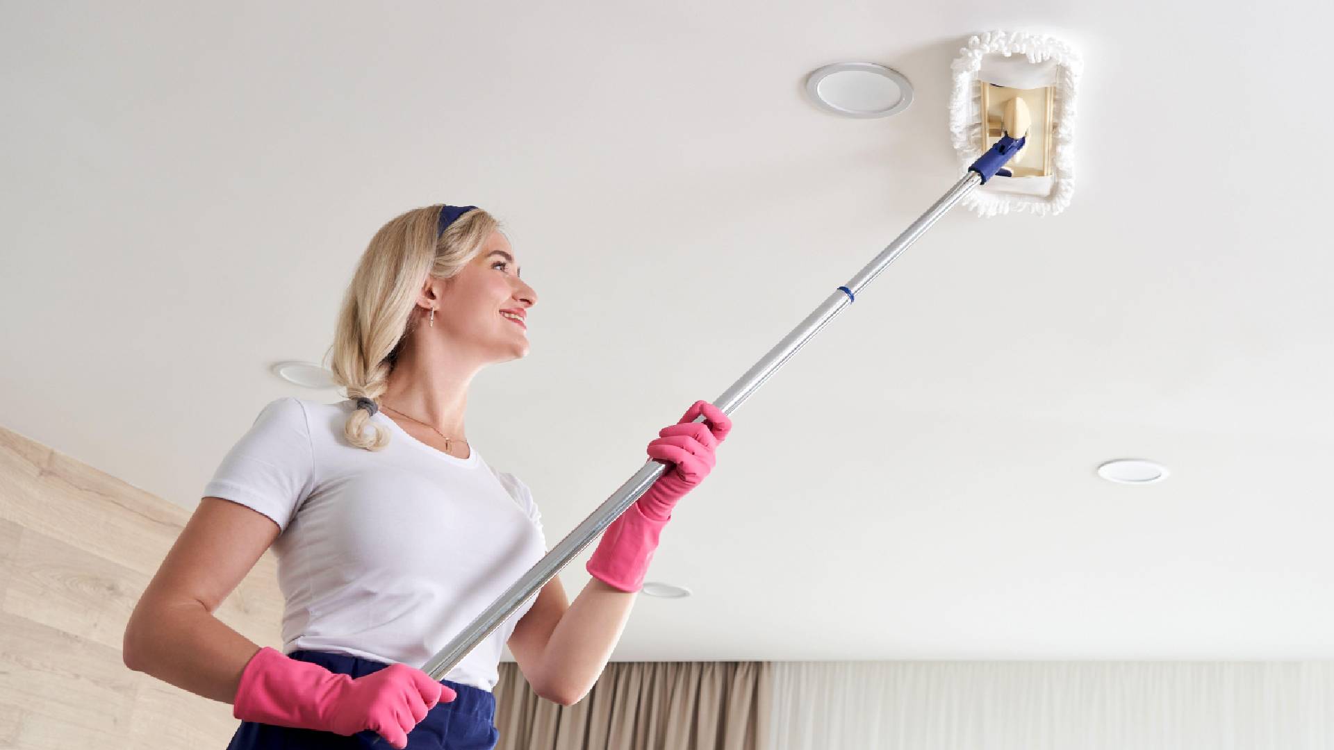 «С натяжного потолка нужно регулярно убирать пыль, так же как и с других поверхностей. Делать это лучше полусухой мягкой насадкой для швабры, для того чтобы не повредить его. Если вы делаете это с помощью штанги, используйте насадку без острых углов.