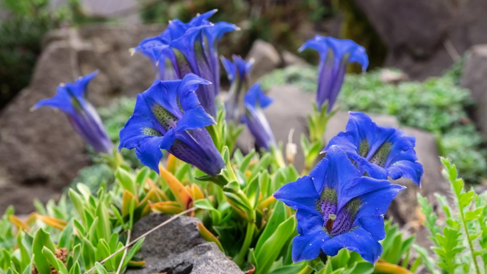 - Горечавка бесстебельная (Gentiana acaulis): Компактное растение высотой около 10 см с крупными, эффектными цветками-сиренами, цветет в мае.