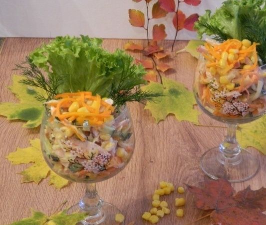 Все нарезанные продукты следует собирать в глубокой салатнице. Сюда же добавляют морковь и кукурузу, смешивая их для равномерного распределения вкусов.