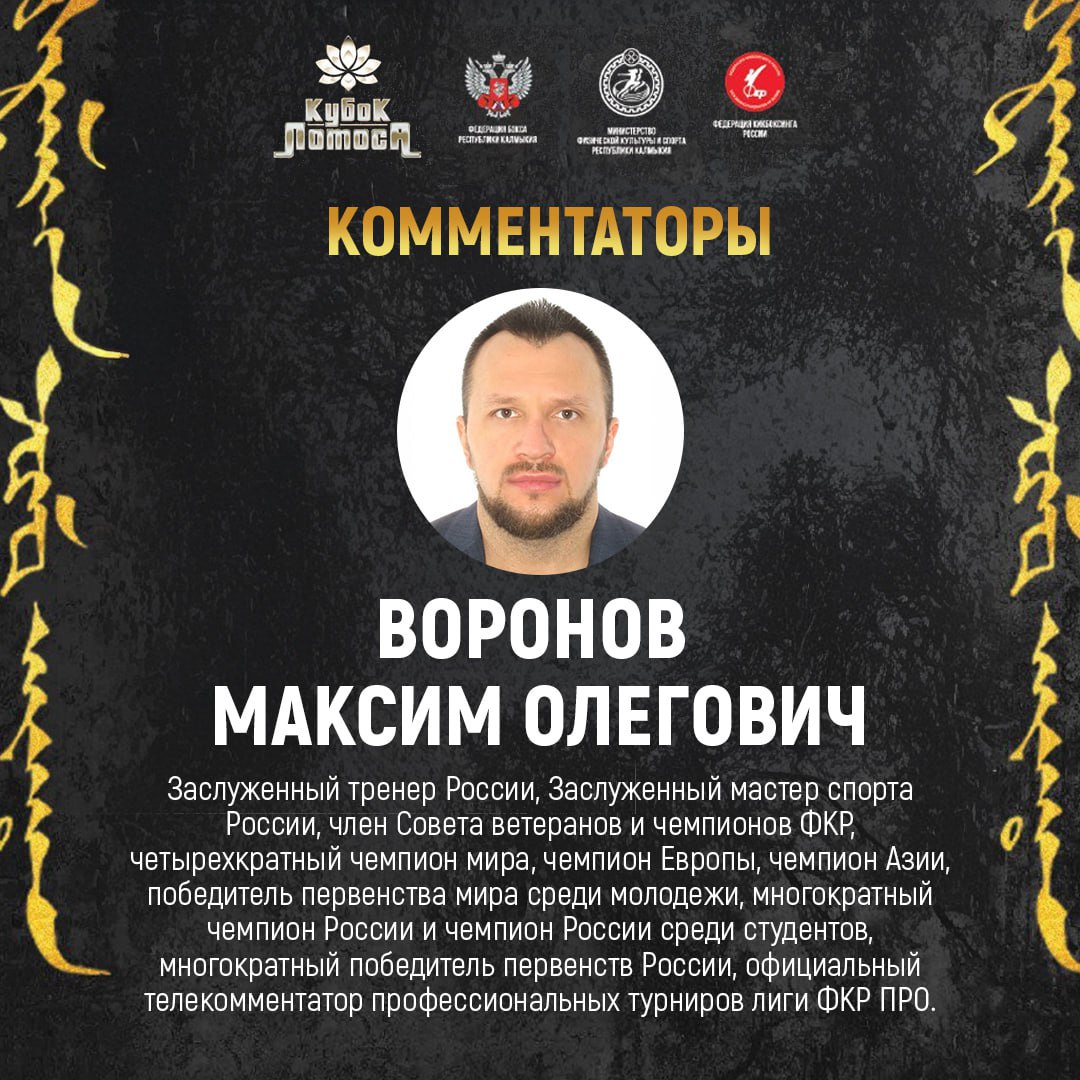 Воронов Максим Олегович — Заслуженный тренер России, Заслуженный мастер спорта России, член Совета ветеранов и чемпионов ФКР, четырехкратный чемпион мира, чемпион Европы, чемпион Азии, победитель первенства мира среди молодежи, многократный чемпион России и чемпион России среди студентов, многократный победитель первенств России, официальный телекомментатор профессиональных турниров лиги ФКР ПРО.
