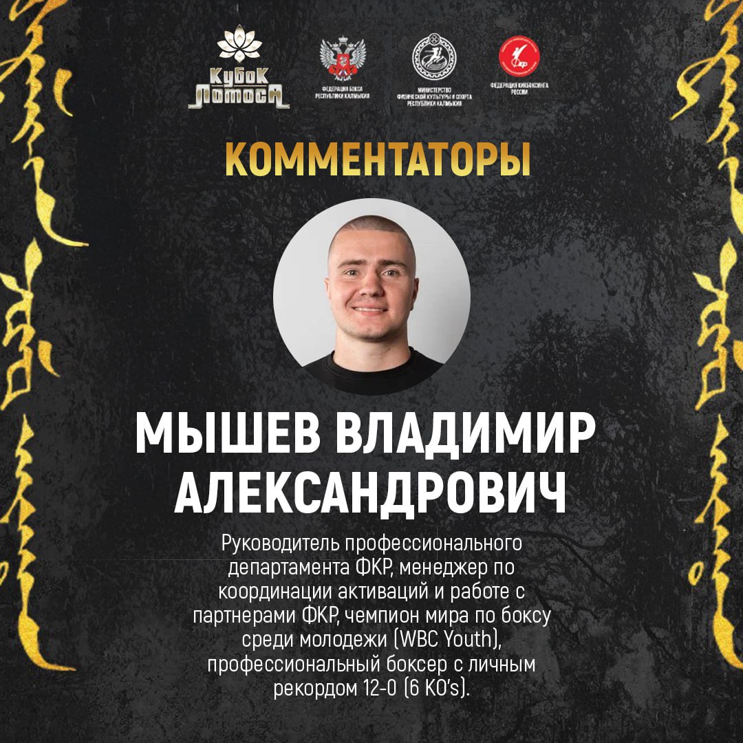 Мышев Владимир Александрович — руководитель профессионального департамента ФКР, менеджер по координации активаций и работе с партнерами, чемпион мира по боксу среди молодежи (WBC Youth), профессиональный боксёр с личным рекордом 12-0 (6 KO’s).