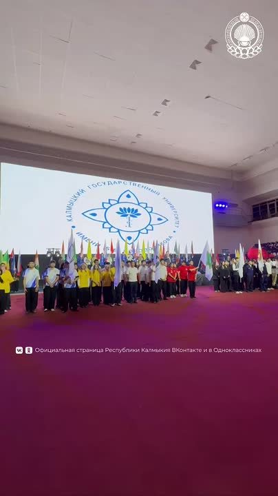 Под кадры кинохроники и звуки торжественного марша на сценическую площадку вышли студенты КалмГУ с флагами стран, представители которых сегодня обучаются в вузе. На трибунах «Ойрат-Арены» расположились молодые вузовские лидеры, на почетных местах перед сценой – родители и наставники студентов-отличников вуза.