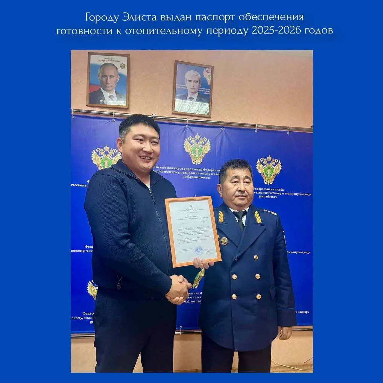 Нижне-Волжским управлением Ростехнадзора подтверждена готовность муниципального образования городской округ Элиста Республики Калмыкия к отопительному периоду 2025-2026 годов. Заместитель руководителя Нижне-Волжского управления Ростехнадзора Мерген Павлович Лиджиев вручил главе муниципального образования «Городской округ город Элиста» Алдару Васильевичу Лиджикову паспорт обеспечения готовности к отопительному периоду 2025-2026 годов.