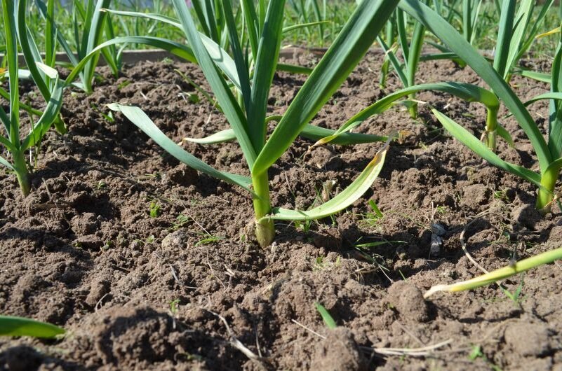 В начале июня настоятельно рекомендуется проводить подкормку чеснока. Подходит органическое удобрение с высоким содержанием азота. Для этого можно использовать настой коровяка, который эффективно насыщает почву необходимыми питательными веществами.