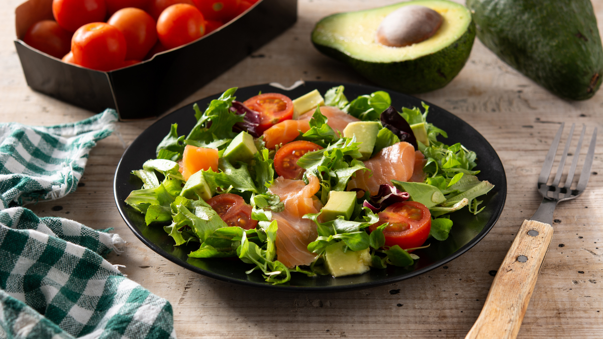 Чтобы создать этот салат, достаточно помыть помидоры, нарезать их пополам, а авокадо очистить и нарезать кубиками. На тарелке разместите рукколу, помидоры, авокадо и кусочки рыбы. Сбрызните все оливковым маслом с лимонным соком, и вот, легкий, но очень полезный обед готов.