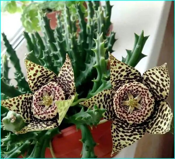 - Стапелия звездчатая (Stapelia asterias) — цветки имеют звездообразную форму с острыми кончиками лепестков.