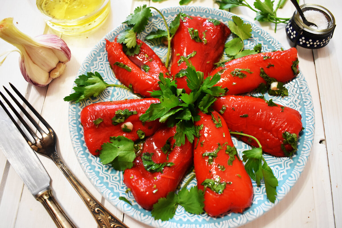 Пока перцы готовятся, настало время заняться заправкой. Чеснок нарезается тонкими пластинами, а петрушка измельчается. В отдельной миске смешиваются оливковое масло, винный уксус, чеснок и петрушка. В завершение по вкусу добавляется соль — и вот она, ароматная заправка, готова.