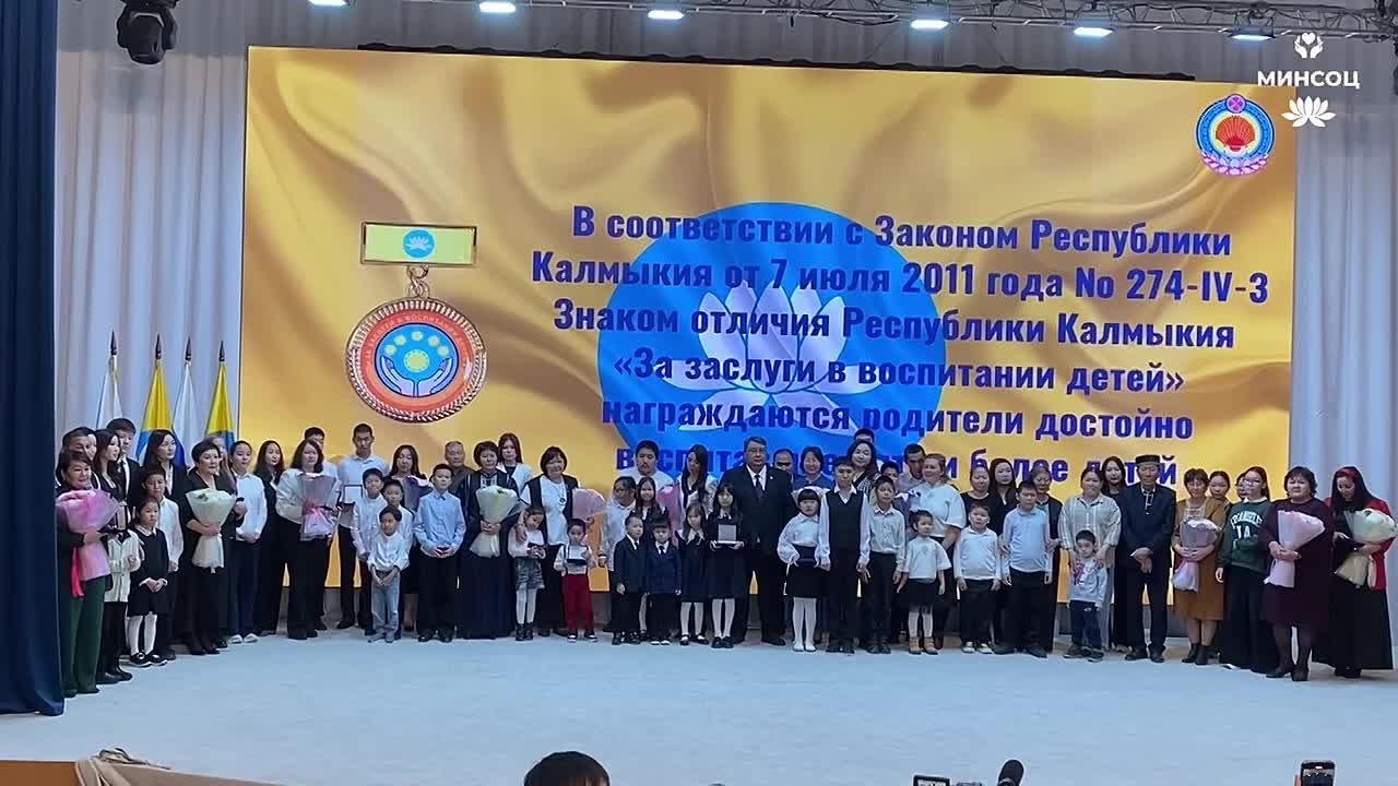 Одиннадцати семьям, воспитывающим пятерых и более детей, вручили знаки отличия «За заслуги в воспитании детей». Это Руслан и Сацита Темуркаевы из Городовиковского района; Виктор и Нина Бурлыковы из Кетченеровского; Санал и Любовь Кадаевы из Целинного; Юрий и Надежда Убушеевы из Черноземельского; Гаря и Марина Сокалиевы из Юстинского; Мерген и Марина Гуспановы из Яшалтинского; Аркадий и Клара Оргаевы из Яшкульского района; и элистинские семьи: Михаил и Кермен Тимашовы, Виктор и Делгер Ходеевы, Владимир и Ева Манджиевы, а также Антонина Озаева.