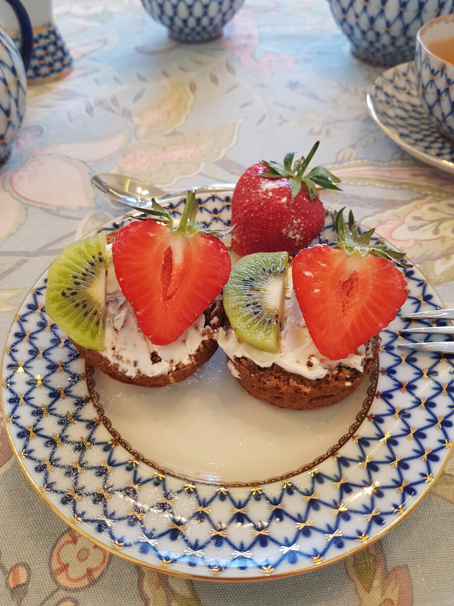 После того как кексы приятно зарумянятся и остынут, их можно разрезать пополам. Для изящной подачи половинки смазываются творожным сыром, на который укладываются ломтики свежих киви и клубники. Это не только красиво, но и добавляет кексам свежести и яркого вкуса.