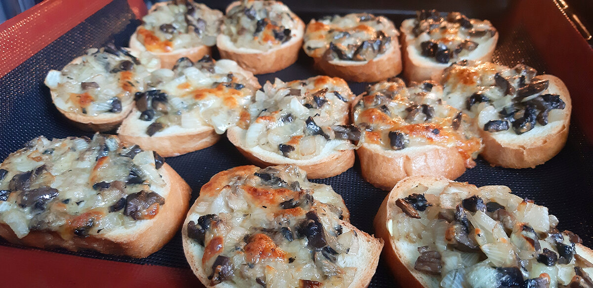 7. На противне, выстланном пергаментом, размещаются ломтики, на которые равномерно распределяется грибная начинка. Оптимально использовать анти-скользящий коврик для выпечки.