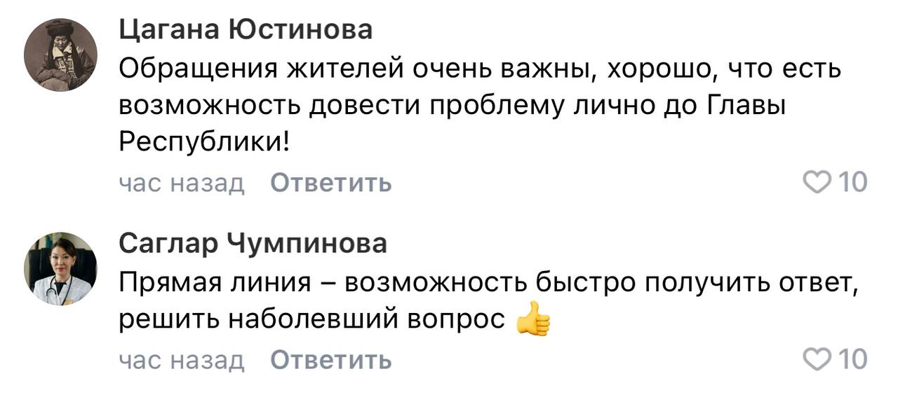 «Обычное обращение рассматривается 30 дней, а обращение на Прямую линию Главы – в разы быстрее. Поэтому спасибо за возможность решить быстро вопрос», - отмечает жительница Калмыкии.