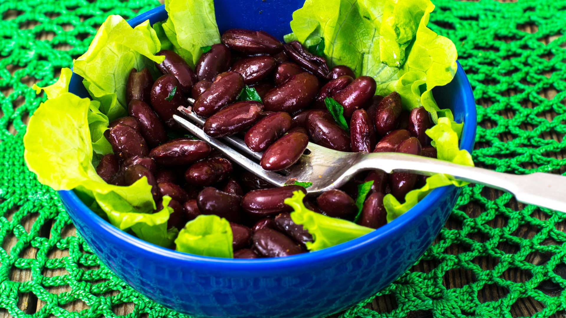 Слейте из фасоли сок и промойте ее под холодной водой. Нарежьте лук, зелень и добавьте в фасоль. Туда же отправьте творожный сыр, пропущенный через пресс чеснок, лимонный сок и оливковое масло.
