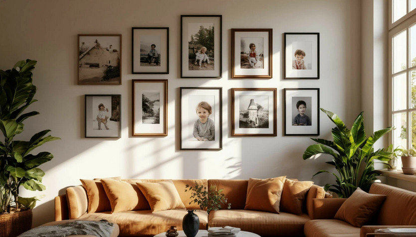 Настенное оформление может стать настоящей художественной галереей, если добавить к ней личные моменты. Замените стандартные репродукции фотографиями из поездок, портретами близких или работами детей. Используйте рамки разных стилей и форм для создания асимметричной композиции. Это добавит динамики вашему пространству и сделает его более живым.
