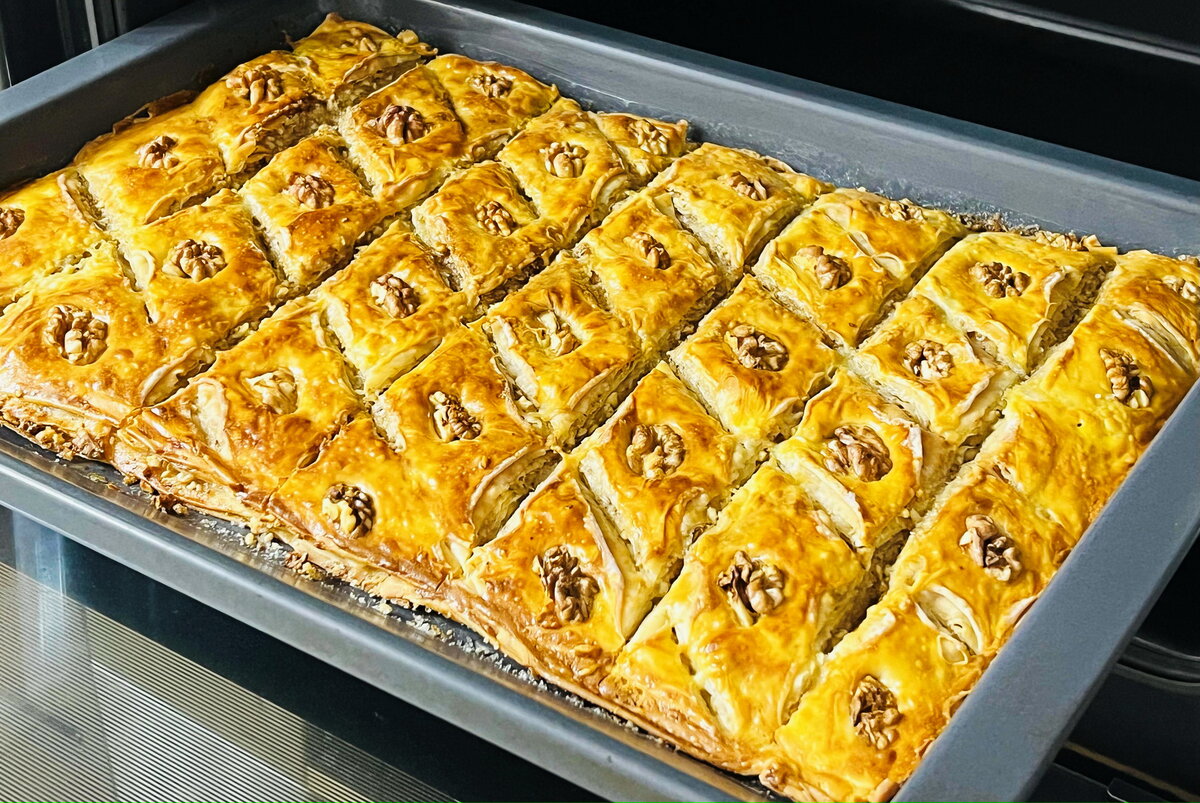 Грецкие орехи измельчают в блендере, затем смешивают с сахаром и специями, создавая насыщенную и ароматную начинку.