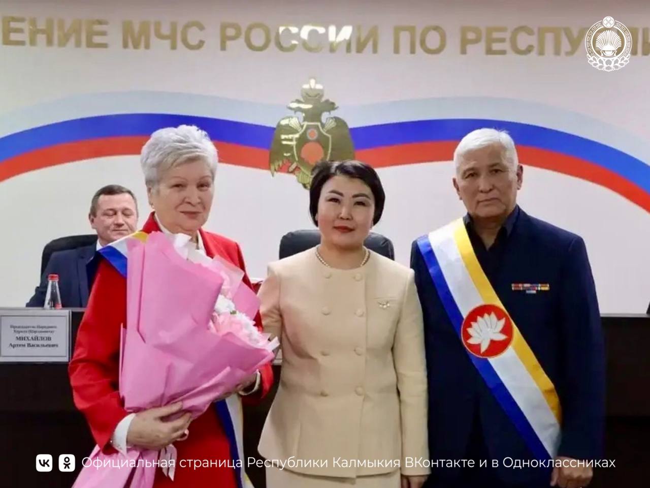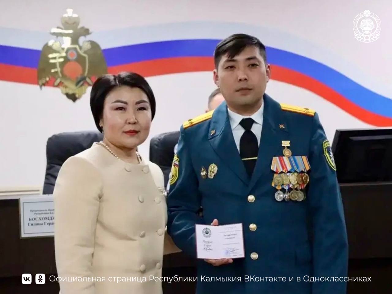 Кроме того, отличившиеся сотрудники МЧС получили из рук Председателя Правительства благодарственные письма Главы Республики Калмыкия. Благодарности Правительства РК были вручены не только сотрудникам ведомства: Саналу Басанову, Елене Казиевой и Александру Бадаеву, но и личному составу ГУ МЧС России по РК за содействие в успешном проведении III Международного буддийского форума в Элисте.